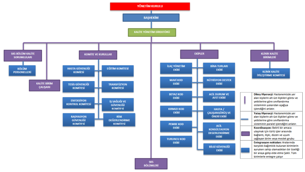Yukarıdaki organizasyon şeması; kalite yönetiminin hastane genelinde nasıl yapılandığını, görev ve sorumlulukların nasıl dağıtıldığını ve bu yapının nasıl işlediğini göstermektedir. Yönetim Kurulu ve Başhekim’in liderliğinde, Kalite Yönetim Direktörü koordinasyonunda çalışan birimimiz; komiteler, ekipler ve SKS bölümleriyle birlikte entegre bir yapıda görev yapmaktadır.