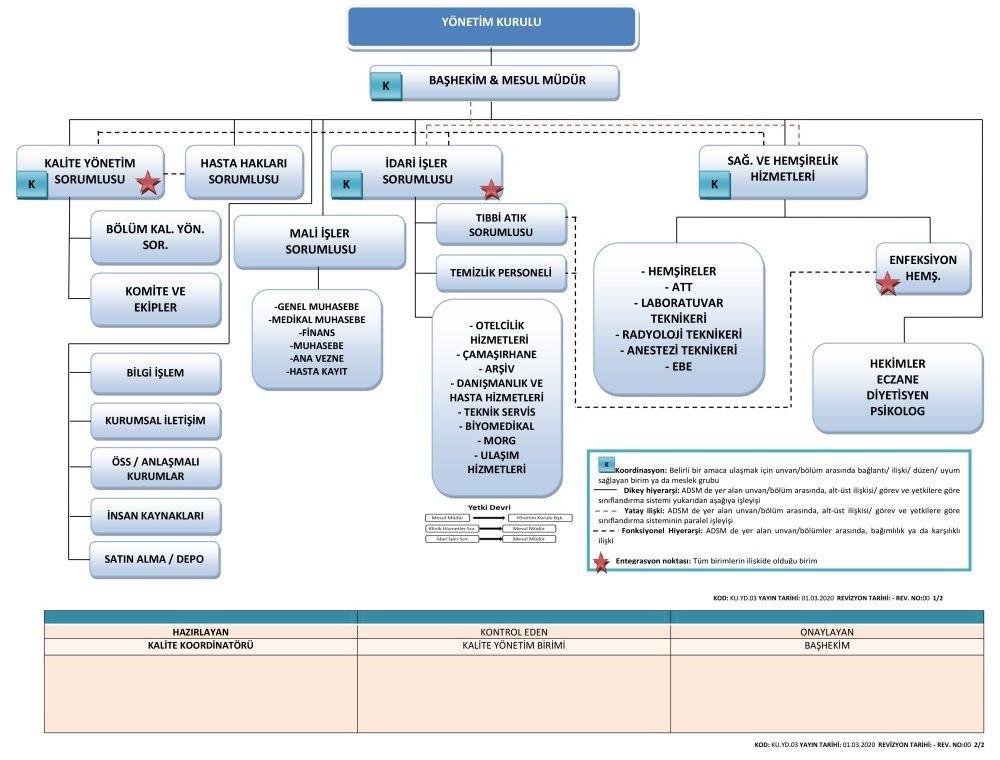 Organizasyon şemamızda, Yönetim Kurulu’nun liderliğinde Başhekim ve Mesul Müdürümüzün rehberliğinde görev alan birimlerimiz açıkça belirtilmiştir. Kalite Yönetim Birimi, Hasta Hakları, İdari İşler, Mali İşler ve Sağlık Hizmetleri gibi temel alanlarımız kendi sorumlulukları ve alt birimleri ile birlikte, hastanemizin sorunsuz ve etkin işleyişini sağlar.